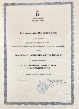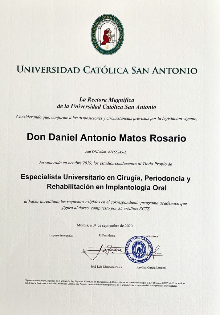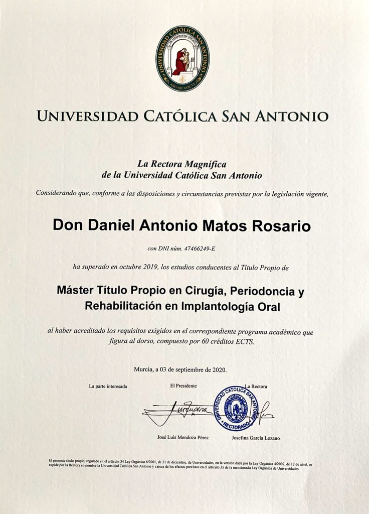 - Máster Int. en cirugía oral, periodoncia e implantología, cirugía bucal y maxilofacial en la UCAM (Universidad Católica San Antonio de Murcia)